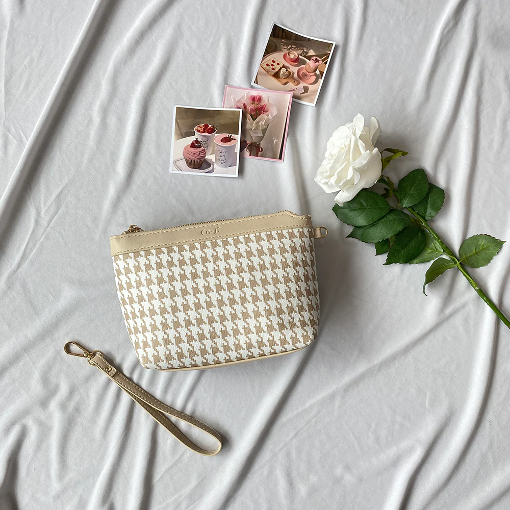 Koleksi pouch terbaru dari enji hadir dengan aksen motif gingham houndstooth yang kekinian. Tersedia dengan kombinasi warna pastel yang sweet. Terdapat hand strap yang bisa dilepas pasang dan bisa dimasukkan ke pergelangan tangan. Sori pouch sangat praktis untuk membawa barang-barang favoritmu termasuk dompet panjang dan smartphone kesayangan kamu.